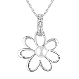 This flower pendant features a round white freshwater pearl (3-3.5mm, grade AAA) set in 10K white gold. Accented with a bead set diamond (I-J, I2-I3) totaling .005 ctw, pendant is linked to a 17-inch rope chain secured with a spring ring clasp.