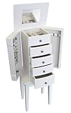 Our classic white floor standing jewelry box armoire features a lift lid with interior mirror. The top compartment features central ring roll section flanked by six open sections, four open drawers and dual necklace doors that house four double hooks each. Antiqued brushed pewter tone drawer pulls and hardware. Hand-lined in ivory sueded fabric. Square tapered legs.